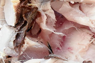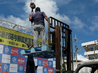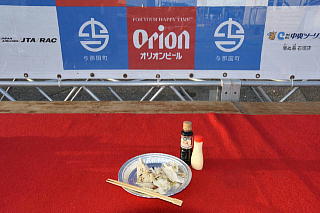 | フォークリフトで会場に運ぶ。 | 会場に到着。 | 肉質は淡泊なので、 シーチキンのようなイメージである。 醤油、マヨネーズ、タルタルソース なんかを持っていくとよい。 まずは参加選手に配られ、 それから一般客に「配給」される。 ただ、軍手で肉をガッと掴んで ゴロンと渡されるので、量が多い。 1人で食すなら、焦げてない部分を ほんの少し分けてもらえば十分。 |