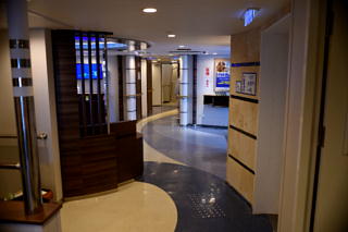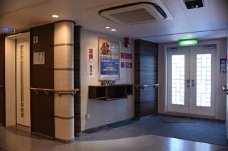 | フェリーよなくにのエントランス。 前の船は、俺が乗った2000(平成12)年 の時点で就航から12年が経っており、 既にかなり疲れていたが、 この船は、まだ2年程度なので、 「新しい感」が満載。 |