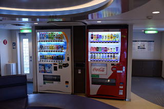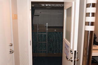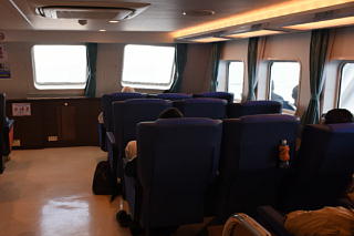 2段式のベッドルーム。 料金不要で、運賃の3,550円で利用できる。 さぞ、早い者勝ちになるんだろうと思い、 あとで会社に問い合わせたら、 「デッキで風に吹かれたい人や、 椅子席でTVを見たい人などいろいろ だから、特に人気が高いことはない」 だって。なるほどね。 確かに窓はないし、暗いし。 夜行便じゃないんだもんね。 |