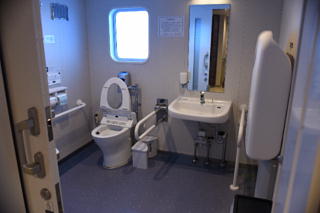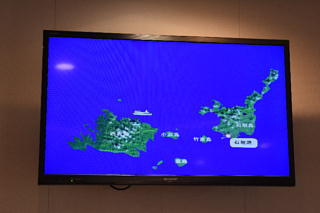 | 広いグローバルトイレ。 | 現在位置が分かる。 どうせなら船の向きも合わせてほしいな。 石垣方面に航行する便での表示でも、 船は与那国を向いている(笑)。 |