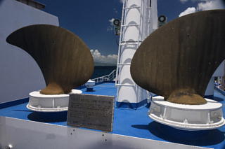 この船のスクリュープロペラの説明。 角度可変タイプなので、回転方向が 同じままで、前進・停止・後退が できるんだって。 |