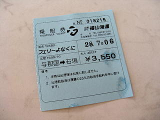 | フェリーのチケット。 出港日のみの発売。 この券を置いたテーブルが濡れていて、 少し染みになってしまった。 下船時に乗組員に渡すので、 なくさないようにね。 |