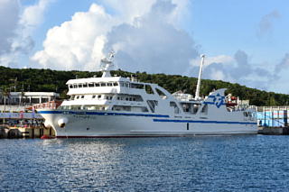 新しくなった「フェリーよなくに」。 与那国島を発つ日がちょうど出港日に 当たっていることに、航空券を往復割引で 買った後に気付いた。 せっかくなので復路をキャンセルして、 フェリーに乗ることにしたが、 飛行機の往復の割引率が高いため、 「往飛行機+復フェリー」の方が 「飛行機の往復割引」より高くなった。 なんなんだ。 ま、い〜けど。 |