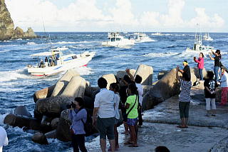 朝7時に一斉に漁場にダッシュする。 普段は池のような静かな港内に 台風の時のような波が立つ。 |