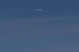| 同方向に飛んでいる機がいるな〜 と思っていたら、 その間をJAL系と思われる対向機が 一瞬ですれ違った。 なんせスピードが高い飛行機の すれ違いを撮ろうと狙っているので、 見逃さないように常にカメラを手にして いないといけない。 他の乗客からすると「ヘンなヤツ」 に見られているに違いない。 |