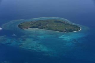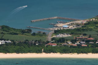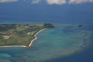 | 与那国に向けてフライト! | 風の関係で、夏は南に向けて飛び立つ。 その後、与那国島がある西に向けて ぐい〜〜〜んと右に旋回して やいまの島々を眺められる、 まるで遊覧飛行になる。 この写真は、人口より牛の方が多い黒島。 |