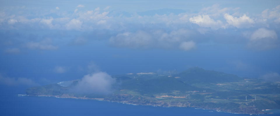 | JTA071便から、そろそろ着陸する石垣島の伊原間付近の風景を撮っていたら、 遙か彼方の雲間に島影が見えた 実際に機内から注意深く見ていると、雲ではなく「山」であることが分かる。 与那国島とは直接関係ないが、↓の「与那国島越しに台湾」の写真のツカミとして取り上げたよ。 |