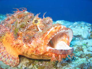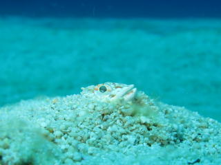 | 今日ラストの3本目は、 島の西すぐの西崎で大物狙い。 海は、不気味なほど穏やかだ。 白波1つ立たないもんね。 でも、空はだんだん雲が増えてきた。 -25mほどの大きな根(=岩)に掴まって、 サメなどの大物を見ている間に、 目の前に歩くようにやってきたオニカサゴ。 ホントに目の前にいて、 カメラを構えても逃げない (魚はカメラを構えるとたいていは 本能的に逃げる。)から、 とっ捕まえて空揚げにでもしてやろうか と思いたくなる。 |