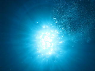 | 砂地の水深約-15mから見上げる。 吐いたエアーがてぃだに向かって行く。 |