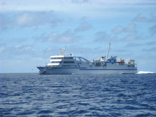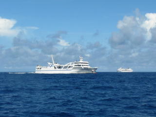 | 1本目の出航とほぼ同時に、 ダイビングボートと同じ港に停まっていた 「フェリーよなくに」(「ぐ」は濁らない。)も 石垣島に向けて出港した。 右は、台湾の基隆港からやってきた クルーズ船。石垣港に向かっている。 |