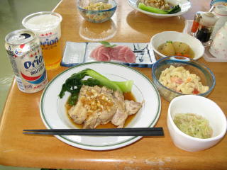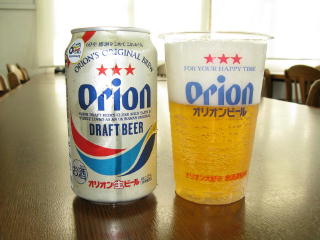 | 今日のお献立。 | ダイビング後は、喉が渇きハラが減る。 まずはキンキンに冷えたオリオンで乾杯! 生もあるけど「自分ルール」で、 それは最終日。それまでは缶にする。 カップはわざわざ持ってきたんだゾ (バカでしょ。)。 でも、生ビールっぽくなるよね。 あ〜楽しいな〜。 |