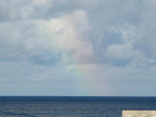 朝、虹が出ていたけど分かるかな。 気付いたときはもっと濃かったが、 カメラを準備しているうちに みるみる薄くなり、 撮影後すぐに見えなくなった。 |