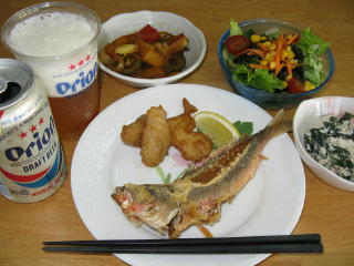 | 晩メシ。 グルクンの空揚げは骨まで喰ったよ。 |
