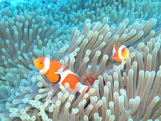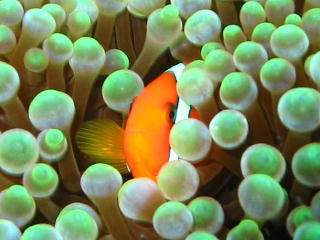 | PowerShot A20&WP-DC200 で撮影したハマクマノミ。 トリミングはしている。 カメラは有効200万画素で、 現在のレベルから見ると 随分少ないが、まだまだ しっかりした写真が撮れる。 |