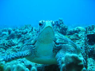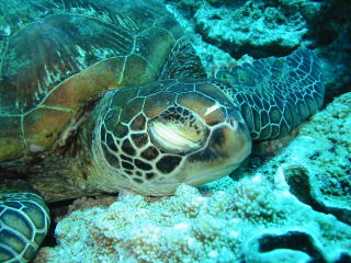 2本目では半分お昼寝中の ウミガメくんがいた。 たくさんのダイバーに やたら写真を撮られて、 さぞ迷惑だったろうに。 |