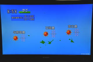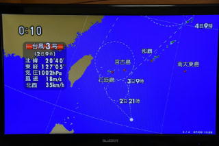 | 3時現在、台風3号が 石垣島付近を通過中。 石垣島地方に暴風・波浪警報が出て いるが、与那国島地方には出ていない。 天気図では暴風域は、ない。 外に出てみたら、風が少しあり、 星が見えるものの、雨がどこかから 飛んで来ている、といった具合。 今日、与那国島を発つ予定の人たちは、 飛行機が飛ぶかヤキモキしている。 今日、与那国島で潜る予定の人たちは、 ダイビングできるかヤキモキしている。 5時半頃になって、石垣島地方の 暴風警報は解除されたが、 波浪警報は引き続き出ている。 与那国島地方は波浪注意報。 |
