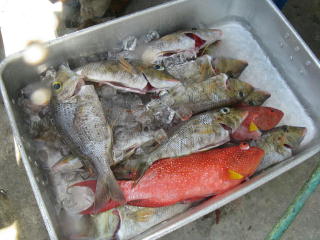 ダイビングが終わり店に戻ってきたら、 オーナーさんたちが船を出して 釣ってきた魚を捌いていた。 釣果は、主にフエフキダイの仲間と ハタの仲間。 どちらも刺身でも煮付けでも旨いが、 煮付けるのは時間がかかるので、 きっと刺身が出てくるんだろうな。 晩メシが楽しみだ♪ |