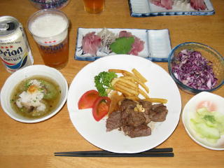 | 晩メシ。今日はステーキだ! しなっこい食感がたまりまへん。 さっきのお魚も刺身で付いた。 その他潮汁もあったけど、 俺は呑んでたので食さなかった。 |