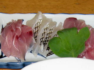 刺身だけを撮り忘れたので ←の写真から切り取った。 赤味がかっているのが、やいまでは ほぼ定番のオオクチハマダイ。 割と大きくなる魚。 白身が、内地では高級魚のメイチダイ。 葉っぱは長命草。 その辺にフツーに生えている(笑)。 |
