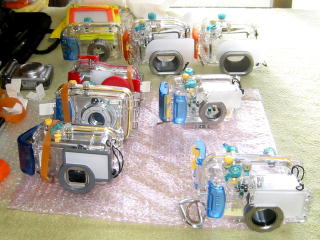 今回持ってきた(といっても 前もってゆうパックで送ってある。) 古いデジカメとハウジングのいろいろ。 写真に写っている以外にもあるが、 この写真だけでも8セットあるね(笑)。 |