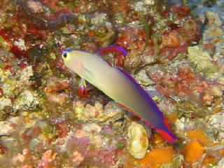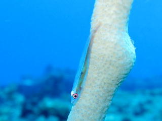 | 1本目は深場のポイントで、 アケボノハゼを見た。 とてもきれいな魚だが、 近付くとすぐに引っ込む。 いったん引っ込むと すぐには出てきてくれないので、 そのときはあきらめるしかない。 せっかく深場まで行って すぐ引っ込ませてしまっては残念だが、 今回のダイバーは みんな魚への近付き方がうまく、 最後に撮影した俺の時まで 引っ込まずにいてくれた。 IXY DIGITAL200a(有効200万画素) &WP-DC600のセットで撮ったもの。 なかなかうまくいったね (トリミングはしてるよ。)。 約-48mにて。 |