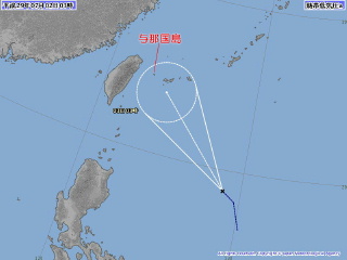 | げげげ〜、熱帯低気圧ができた! この先台風になる見込み。 今のところ与那国島を直撃する 進路予想だよ…。 気象庁のサイトから (赤い文字と直線は俺が加筆した。)。 |
