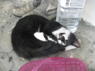 | 店の入口横で ひっくり返って寝ている「クロ」。 |