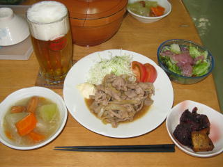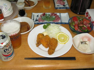 | 晩メシは、カジキのフライに島豆腐。 これはオリオンが進むぜぃ。 |