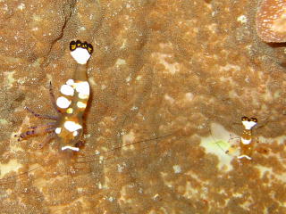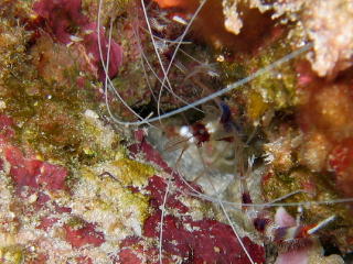 | 昼メシ後の2本目は、のんびり系。 岩の間にオトヒメエビ。 穴に斜めにへばりついている。 |