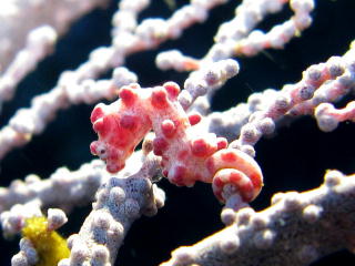 | 1本目は、深場で ジャパニーズピグミーシーホース狙い。 -38mに見事に4匹もいて、 これはそのうち1番大きな個体。 それでも1cmちょっとぐらい。 他にゲスト(客)はいなかったので 独占して撮影できた。 深場での撮影は 時間が数分しか取れないのに、 撮影開始の時にデジカメのディスプレイが 表示されずに焦った。 結局は表示設定がいつの間にか 節約モードになってしまっていたためで、 落ち着いて改めて設定して復活した。 このことがなく、 最初から撮影できていれば もう10枚は多く撮れたので、 事前に確認を重ねることの重要性を、 またしても痛感させられた。 |