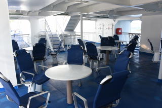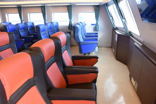 チェックアウトして、 「フェリーよなくに」に乗り込む。 立派なシートだが、普通席。 |