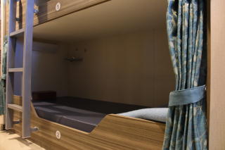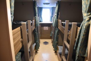 | 寝台席入口。 | 寝台席。 合宿部屋というか、 ドミトリーみたい。 追加料金は、なし。 空いていれば好きに利用できる。 この日は俺以外利用者なし。 |