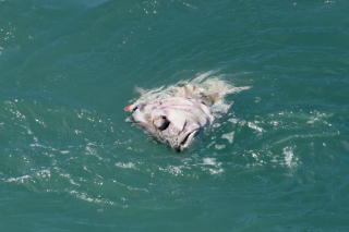 | 出港時の久部良港内に でっかいお魚の生首が浮いていた。 相当でかかったよ。 タテに70〜80cmはあったと思う。 |