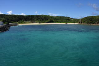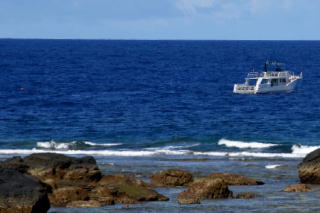 ナーマ浜にもお別れ。 | 西崎ではYDSチームが潜っている。 写真のほぼ左端の、 上から2/5ぐらいのところに 赤い浮きがあるのが分かるかな。 この下にダイバーがいる。 |