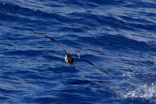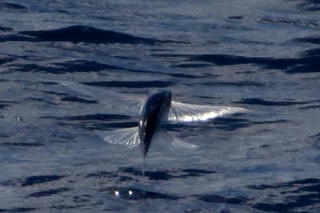 フェリーを止まり木にしているカツオドリが、 トビウオが飛ぶと捕まえに行く。 このトビウオは、 辛くも餌食にならずに済んだ。 |