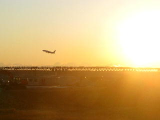 搭乗口の横にはこのマーク。 | 朝日を浴びながら、 各地に向けて次々と飛び立つ。 |