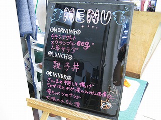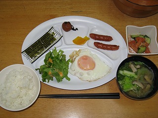 朝メシ。 コメは、軽く2杯に抑えた(笑)。 |