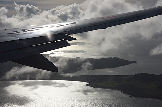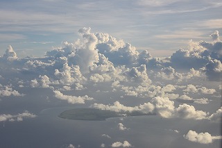 | 石垣空港を離陸する。 | 黒島と雲。 | 小浜島上空には雲がほとんどなく、 28mmの画角に辛うじて収まった。 |