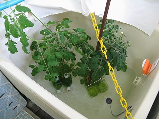 | 俺にとっての問題は「新コロ」よりも、 すくすくと成長期に入り、 水をよく消費するようになった ペットボトルの水耕栽培のトマトの水を 俺が不在の10日間どう補充するか、だ。 いろいろ考えたのだが、バスタブに ペットボトルを置いてそれより少し高く(深く) 水を張り、10日間頑張ってもらうようにした。 ところが、水を入れてもペットボトルってのは 意外に浮力があり、すぐに傾きたがるのだ。 結局、写真のようにプラチェーンで 固定してみた。 果たしてどうなることやら。 |