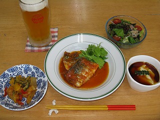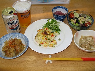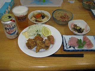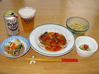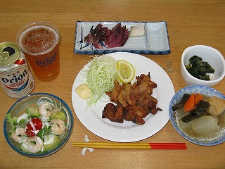 | 晩メシだ〜。 オリオンの最初のひと口は、 ダイビングをしていなかった 昨日のそれとは全く違って、 染みたねぇ〜。 |