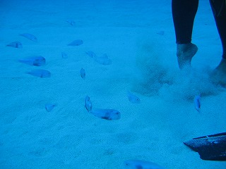 海底の砂をかんましたら、 ちょうどコオニブンブクが出てきた。 すると、ヒノマルテンスが一斉に つつき始めた。 エラい勢いだ。 普段ののそ〜っとしたイメージからは かけ離れていた。 ヒノマルテンスがコオニブンブクをつつく 約15秒の動画はこちら。 |