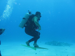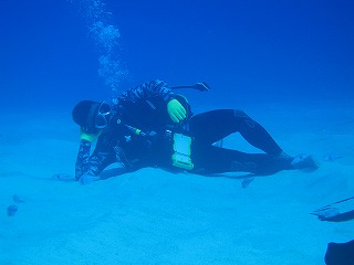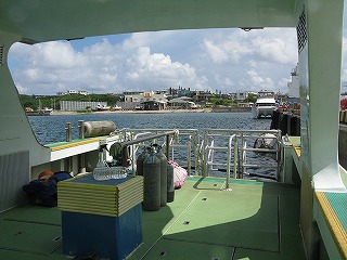 | 急に予定が変更になり、 1本目は島の北側の深場に行く ということで9時出航になった。 ナーマ浜からのんびり帰ってきたところで この話をYDSのスタッフから聞き、 慌てて準備した。 |