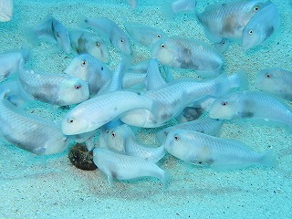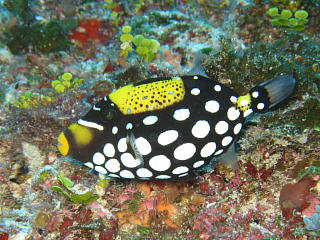 | ゴマモンガラのちび。 これぐらいの頃は好奇心が強いのか、 カメラを向けてもあまり逃げない。 でかくなってくると、 カメラを向けると逃げていくクセに、 ダイバーのフィン(足ヒレ) をかじりに来るんだからハラが立つ(笑)。 |