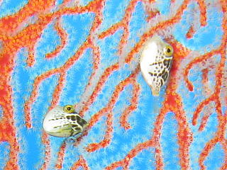 おおおおお〜! 俺の大好きなシマキンチャクフグの、 しかも超yg! 1cmもないゾ。 イソバナで何匹もウロチョロしている。 俺はこの1本はもうこれだけでもいいよ〜。 なんか、風船みたいだね(笑)。 |