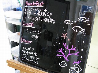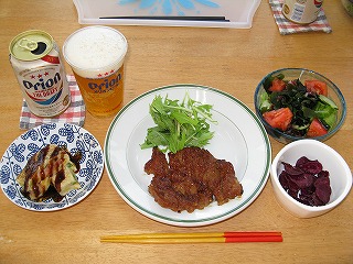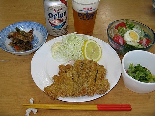| 今日も1日楽しいダイビングでした。 いっぱい遊んだ後は、いっぱいハラが減る。 わ〜い、今日はとんかつだ。 オリオンが進むし、コメも進む。 今日は、YDSで4晩目にして、 初めて、晩メシでコメを喰った。 |