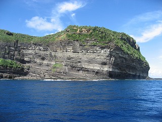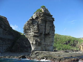楽しんで浮上。 | ついでに、ボートでちょっと移動した ところにある立神岩(たちがみいわ)の 見物にも連れて行ってくれた。 波が穏やかだったので、 目の前までボートを寄せることができた。 |