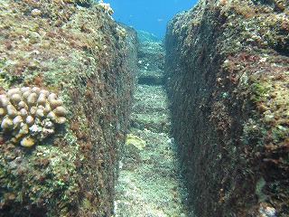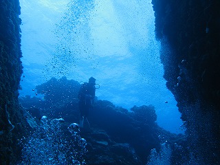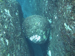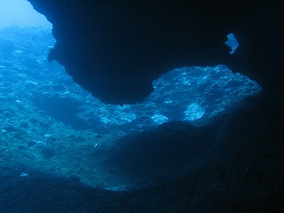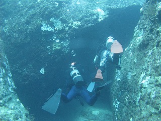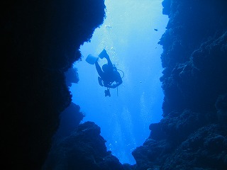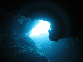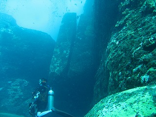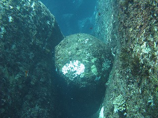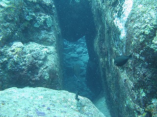 「城門」。 ダイバー1人がやっと通れるぐらいの幅の 隙間がある。 これは出口側から撮影したもの。 |