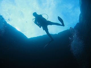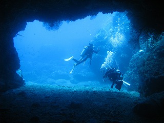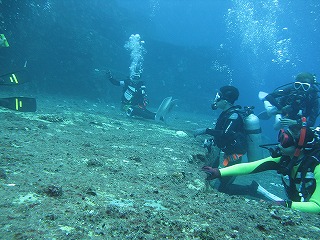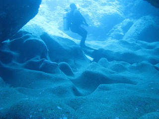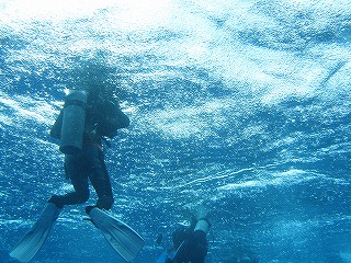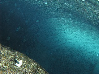 | 拝所を上から見る。 ダイバー1人が底まで行って遊んでいる。 できれば脚を入れたくなかったが、 ちょろちょろ動き回っていつも脚が見えたので しかたなくシャッターを切った(笑)。 |