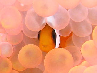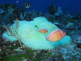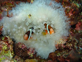 | 昼メシを喰ったら2本目はサバチで潜る。 クマノミがたくさんいる「クマノミ団地」があり、 俺が見ていた「部屋」ではハマクマノミの チビすけがほにょほにょしていた。 約26秒の動画はこちら。 ※写真とは違う部屋(個体)です。 |