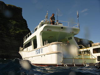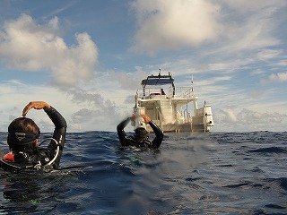 浮上して、スタッフが船長に 「ピックアップOK」のサインを出す。 久しぶりの深場はなかなかおもしろかった。 |